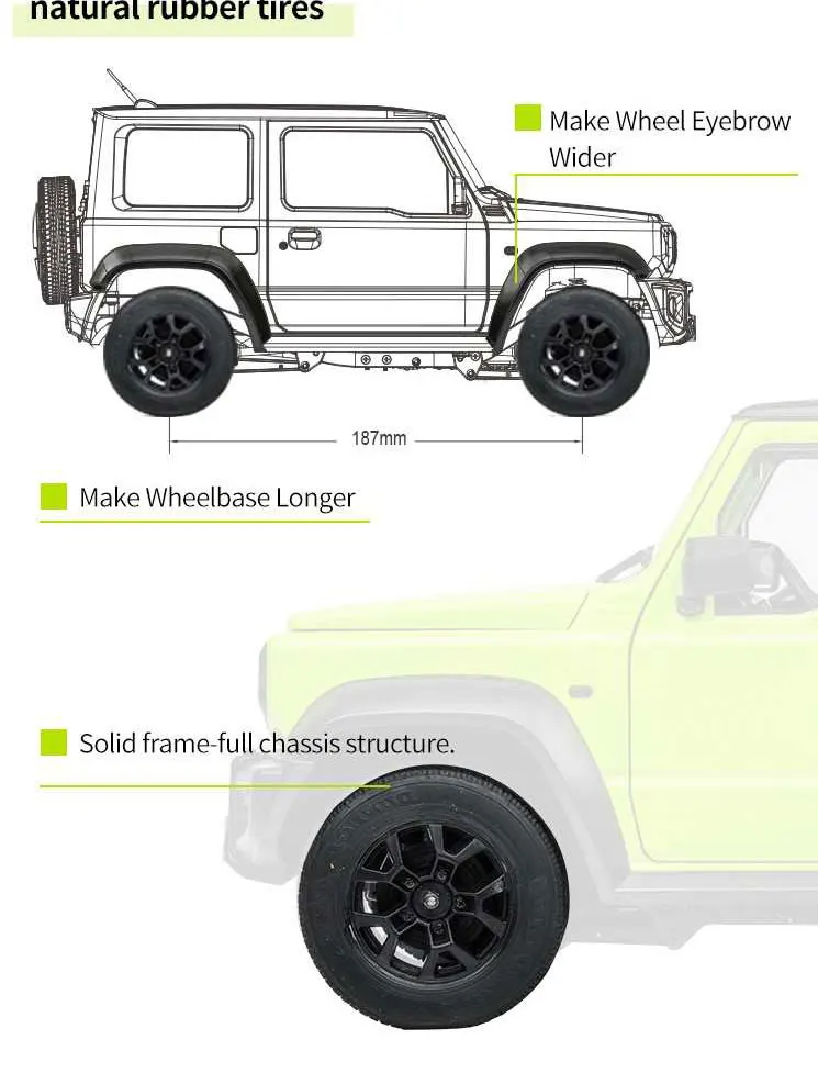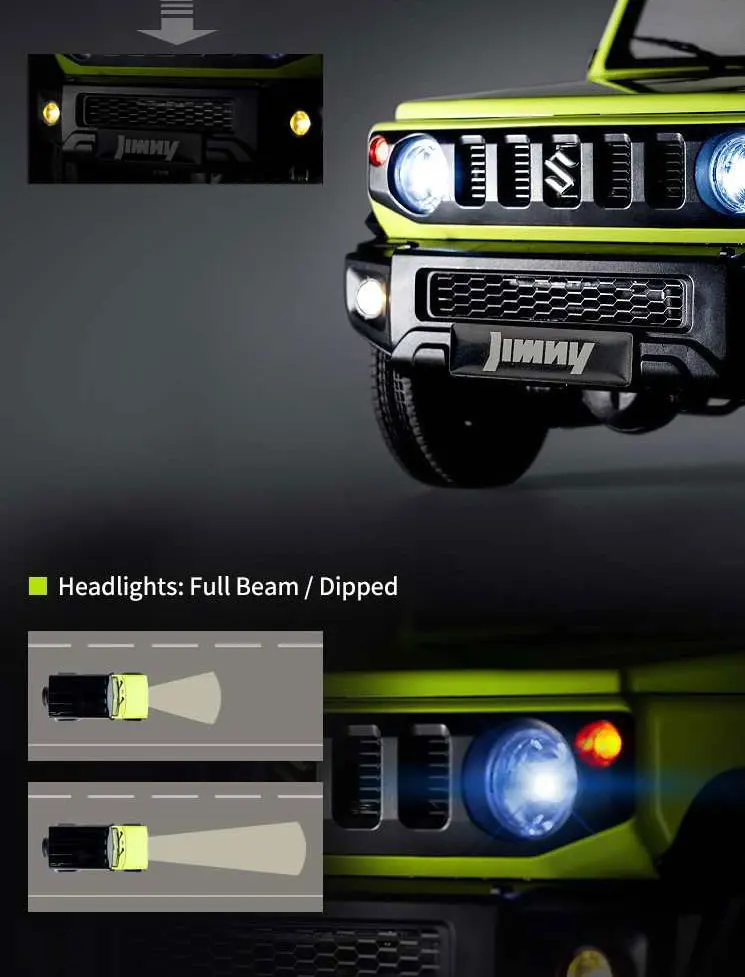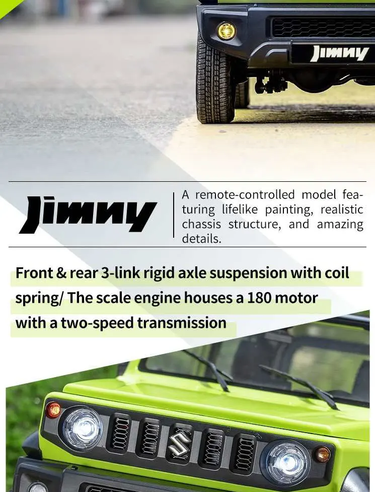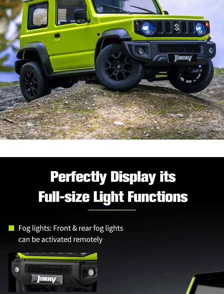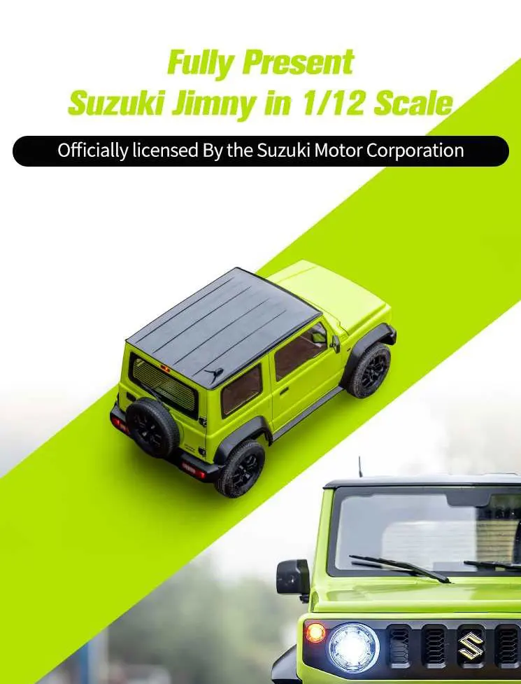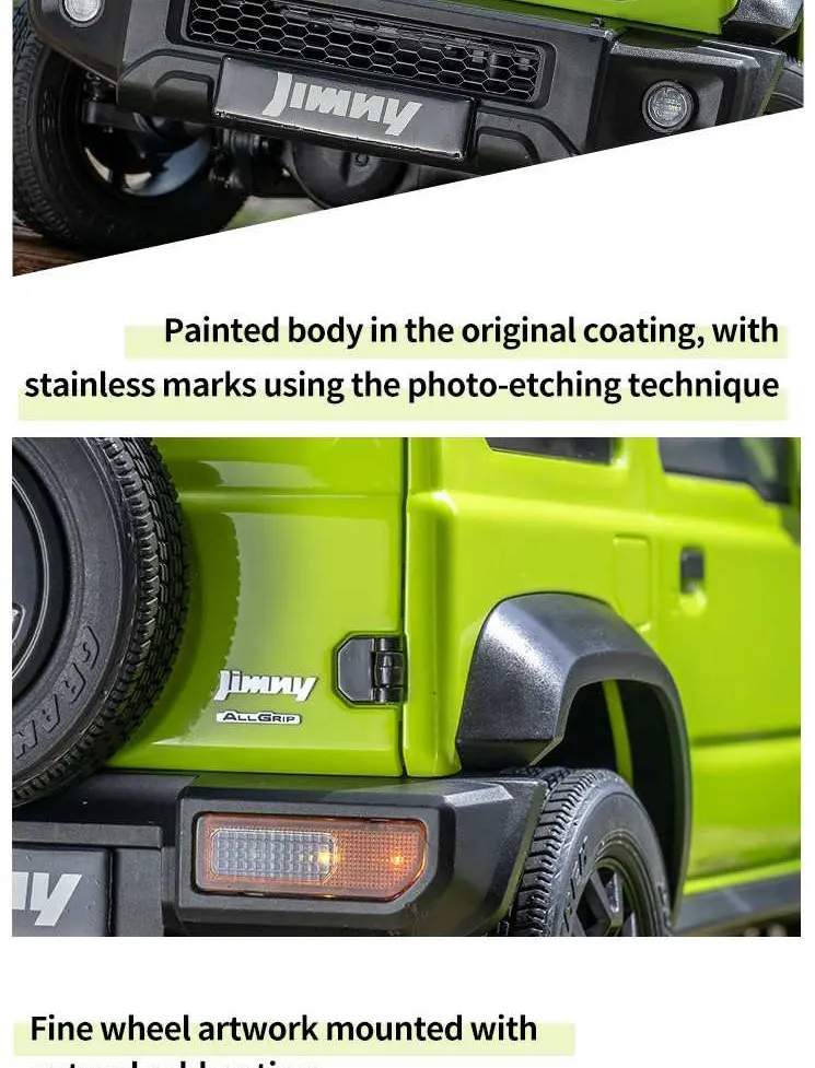 • 【Amazing Appearance Design】With officially licensed product of the Suzuki Motor Corporation; painted body in the original coating, with stainless marks using the photo-etching technique; photo-etching honeycomb grille and authentic movable rear-view mirror; bumpers, wheel fenders and roof can be disassembled for personal modification