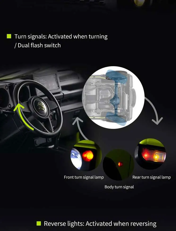 • 【Outstanding Car Light System】Headlights: Full Beam / Dipped ; Turn signals: Activated when turning / Dual flash switch; Fog lights: Front & rear fog lights can be activated remotely; Brake lights: Activated when parking; Reverse lights: Activated when reversing